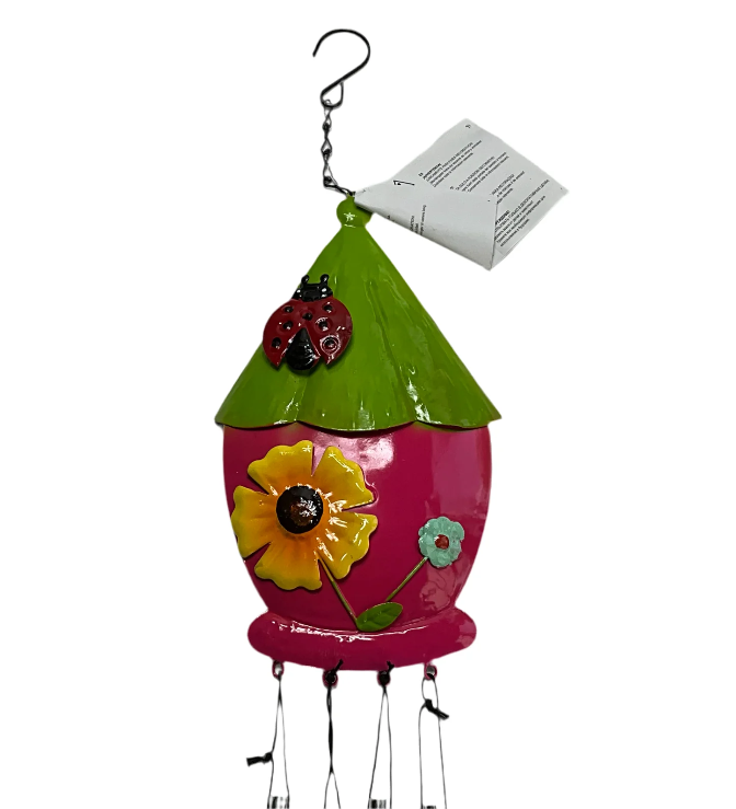 Geef je tuin, balkon of terras een vrolijke en speelse uitstraling met deze kleurrijke windgong. Het metalen huisje is prachtig versierd met bloemen en een lieveheersbeestje, en de windgong buisjes zorgen voor een rustgevend geluid bij een zacht briesje.