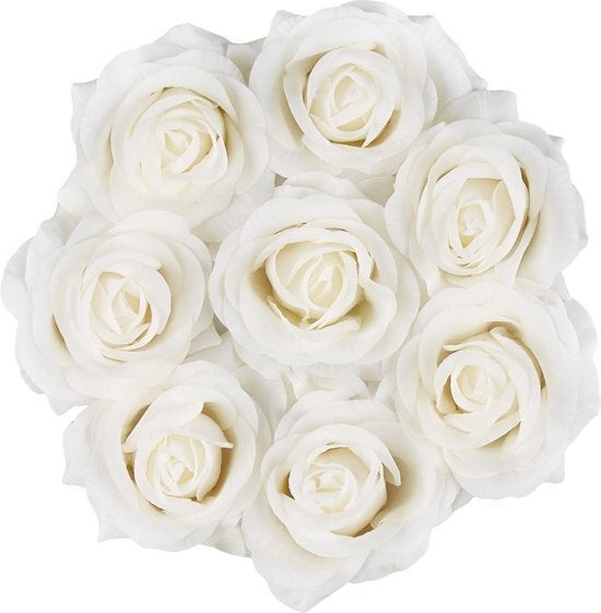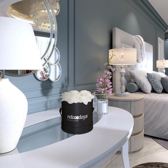 Breng elegantie en stijl in huis met deze prachtige bloemenbox van Relaxdays. De zwarte luxe doos is gevuld met acht realistische witte rozen die jarenlang mooi blijven – perfect als decoratie, cadeau of eyecatcher in je interieur.